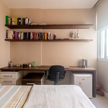 Apartamento de 27 m², em rua residencial arborizada. Composto por 1 quarto com janelão, banheiro, sala acoplada com cozinha planejada, bancada de granito, cooktop e pequena área de serviço.